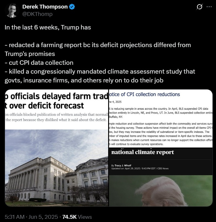 Looking at these stories, I see some mild reasons for concern. Trump did indeed delay and alter a USDA report that said that Trump was going to increase deficits (which is true). But the report did come out, minus the section about the deficit. With regards to the CPI, Trump isn’t trying to block the data from being collected, but his personnel cuts at government statistical agencies have made it much harder to collect the data. And Trump did fire the people preparing a congressionally mandated climate assessment; it’s not clear whether he plans to hire other people to do it, or to simply ignore the mandate.