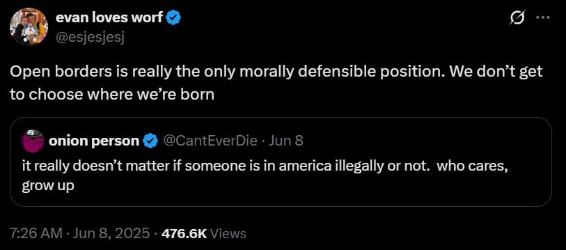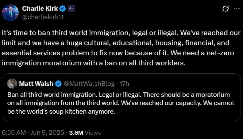 Anti-ICE riots are continuing in L.A., with protests spreading to some other cities. It remains to be seen how big the movement will become, or how harsh Trump’s reprisals will be. In the meantime, the rhetoric on social media around the whole immigration issue is getting pretty hyperbolic. Here are noted right-wing pundits Matt Walsh and Charlie Kirk:
