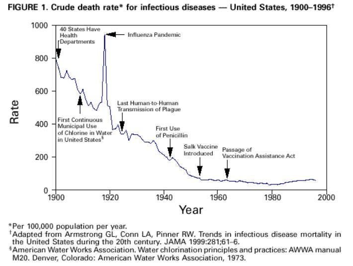 Miasma theory? Seriously??? One X user referred to RFK’s ideas as “actual, honest-to-god medieval peasant beliefs”, and he isn’t wrong. The discovery that germs cause disease — and the subsequent development of vaccines, antibiotics, and sanitation to combat germs — was one of the fundamental break points that lifted humanity out of medieval conditions. In 1900, around 0.8% of all Americans were killed every year by infectious disease; today, in a typical year, it’s about a hundred times lower than that:
