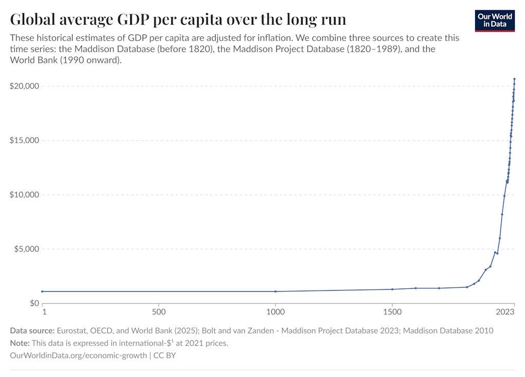 These are useful examples, but they’re all from the premodern period, where cutting-edge science and technology didn’t make a huge difference in people’s standard of living; most people were farmers living on the edge of subsistence. But around 200 years ago, technology really started to matter, and living standards began to skyrocket in a way they never had in history. Thanks to technology, humanity is now about 20 times richer on average than we were two centuries ago, and the number keeps going up: