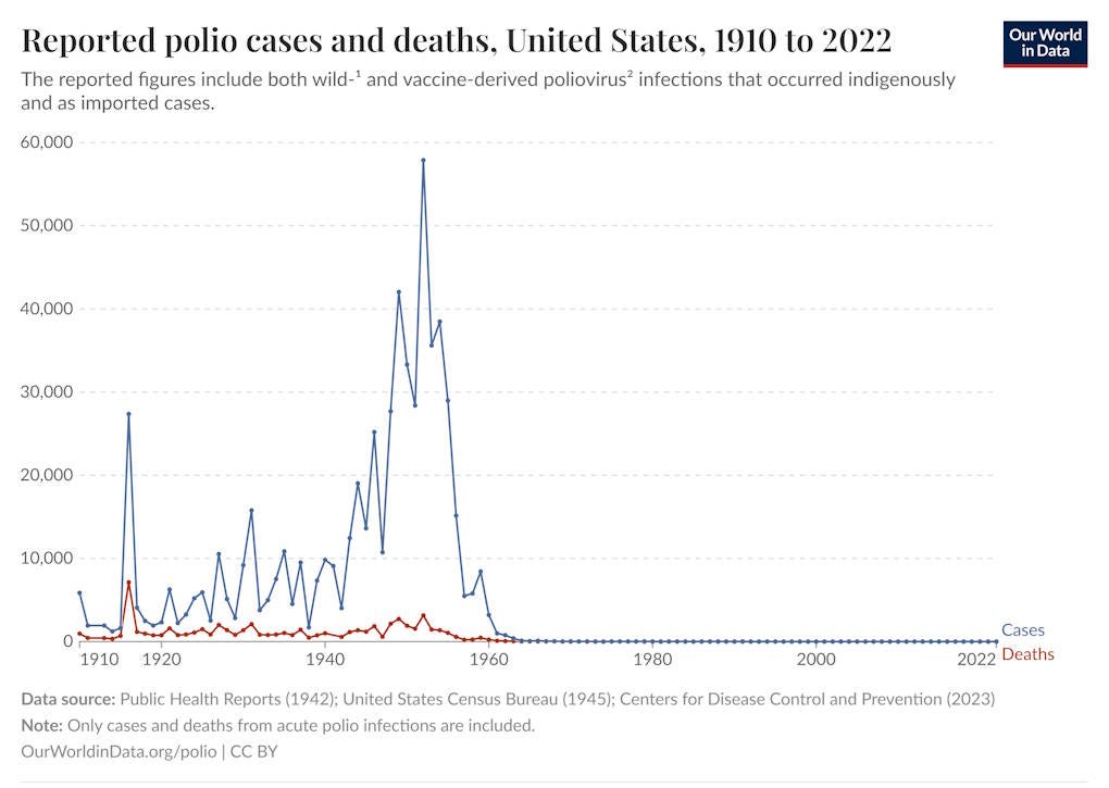 The drop to zero, of course, coincides with the introduction of polio vaccines in 1955, which rapidly defeated the disease.