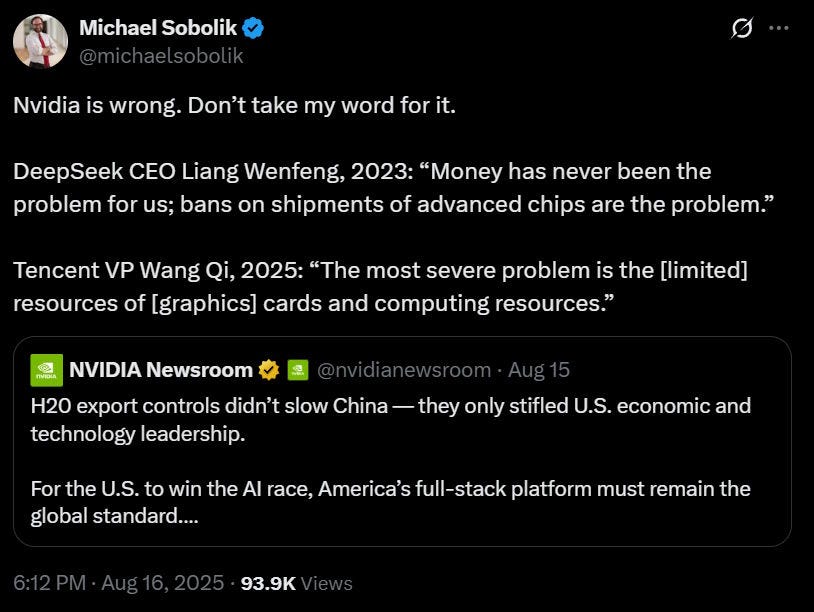 I too also felt that it was never a compelling argument to say we should sell China our high-end chips in order to keep them dependent and to prevent them developing their own AI hardware stack. It always seemed obvious to me that they would try to reverse engineer our stuff whether or not we were selling it to them.