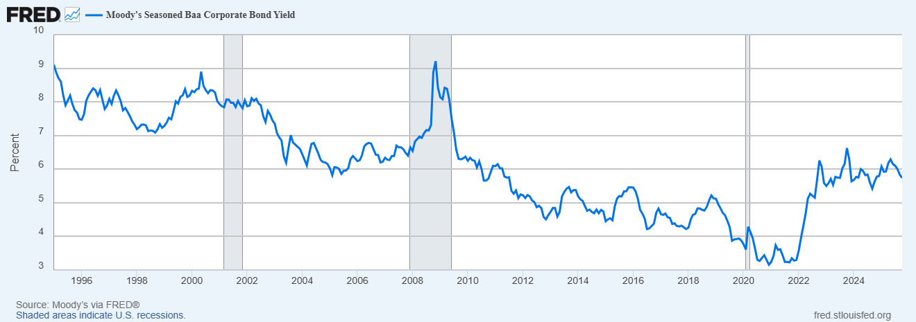 That’s a plausible story, but I think it’s questionable how important it is for the overall economy. Passive investing really took off around 1995. But corporations’ cost of borrowing actually fell from 1995 through 2021: