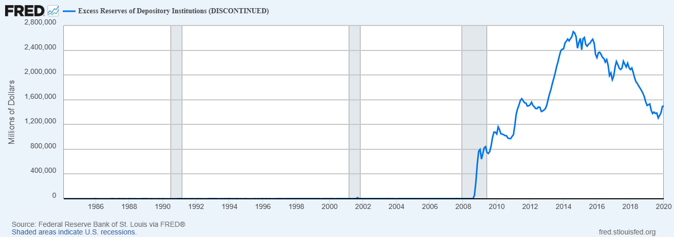 First of all, this misunderstands what it means for a bank to rebuild its balance sheet. It doesn’t mean for a bank to buy stocks and houses and commodities. It means for a bank to hold cash. Banks took the money from QE and essentially stuck it in a vault, holding what’s known as “excess reserves”: