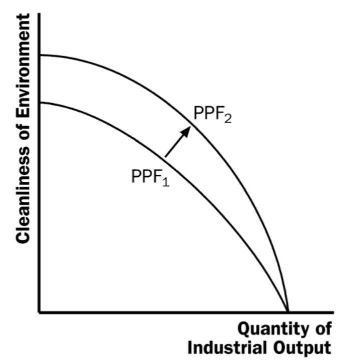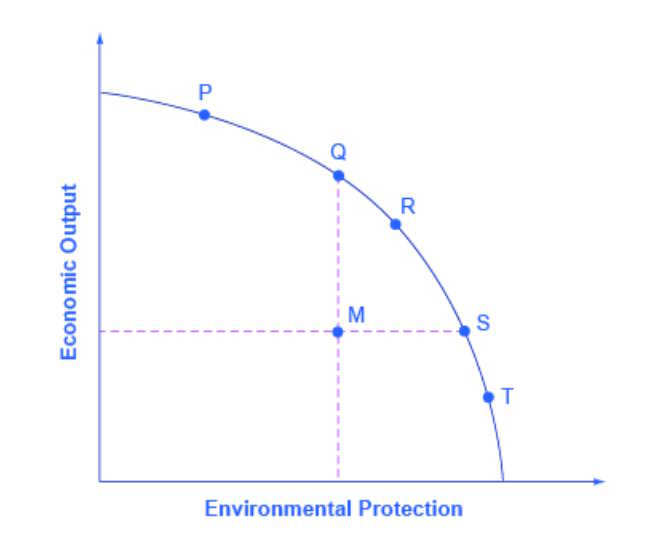 In fact, mainstream economics already has a simple way of depicting this in a memorable picture — a production possibilities frontier. A PPF illustrates society’s tradeoff between two things. You can draw a PPF that illustrates the tradeoff between production and the environment; in fact, introductory econ courses do this all the time: