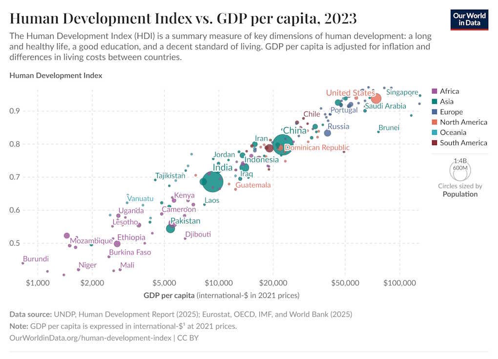 This is my view as well, and it’s the only reasonable conclusion for anyone who has worked in international development (as Raworth has). A lot of people who are dissatisfied with GDP as a measure of human flourishing have spent a lot of time creating alternative measures, like the Human Development Index. These always end up being very strongly correlated with GDP. For example, here’s HDI: