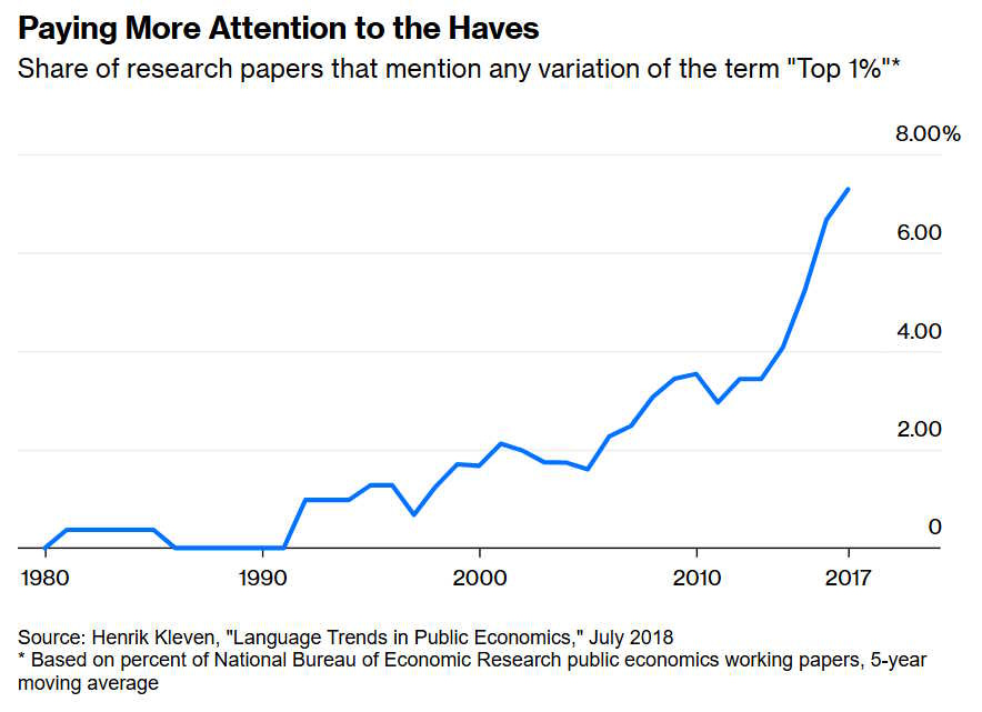 These changes also moved the field more to the left politically. To take just one small example, you can see a lot more economists writing about inequality in recent years: