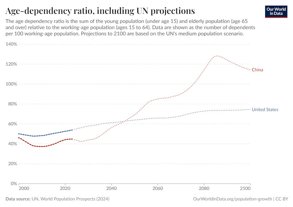 Only in the mid-2040s or so will China’s dependency ratio rise higher than America’s: