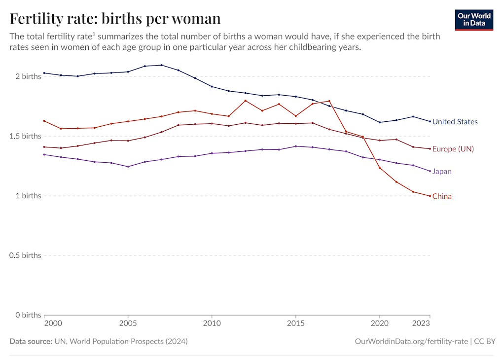 On one hand, there is something to this. Almost all nations are headed for major demographic problems, but China’s will be especially challenging. Its total fertility rate has fallen to 1.0 — one of the lowest in the world, and lower than Japan, Europe, or the U.S.