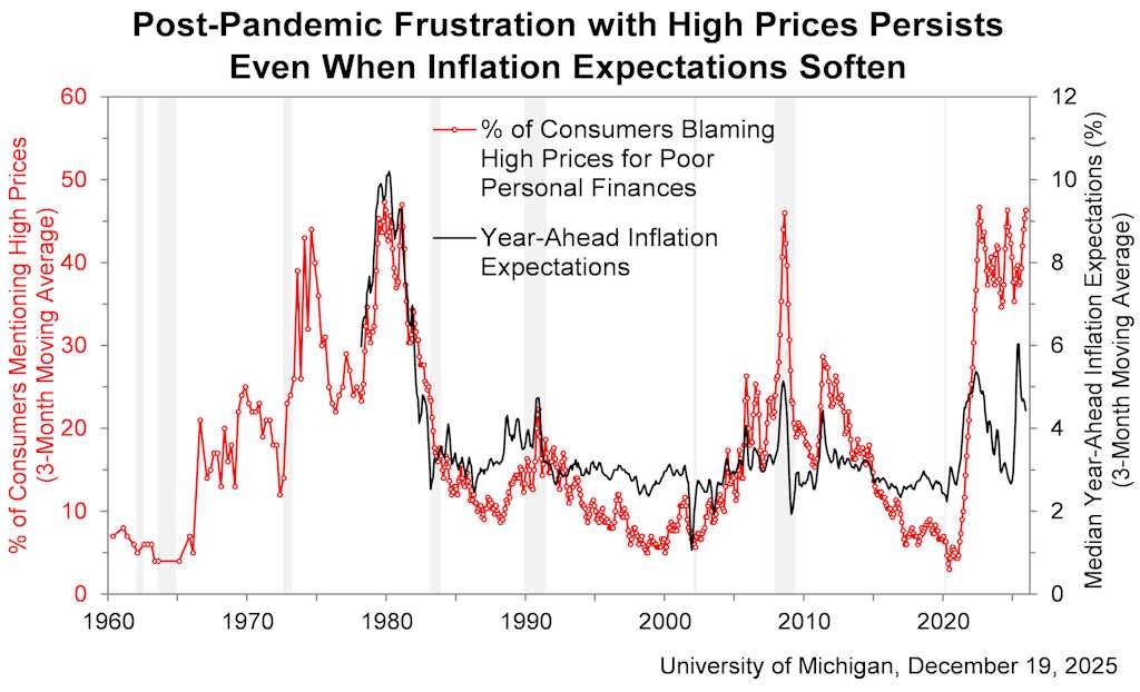 Of course, lots of regular people don’t trust official statistics. But regardless of whether they rely on government numbers, people’s own inflation expectations are falling, and yet the percent of Americans who blame high prices for their poor personal finances is still near record highs: