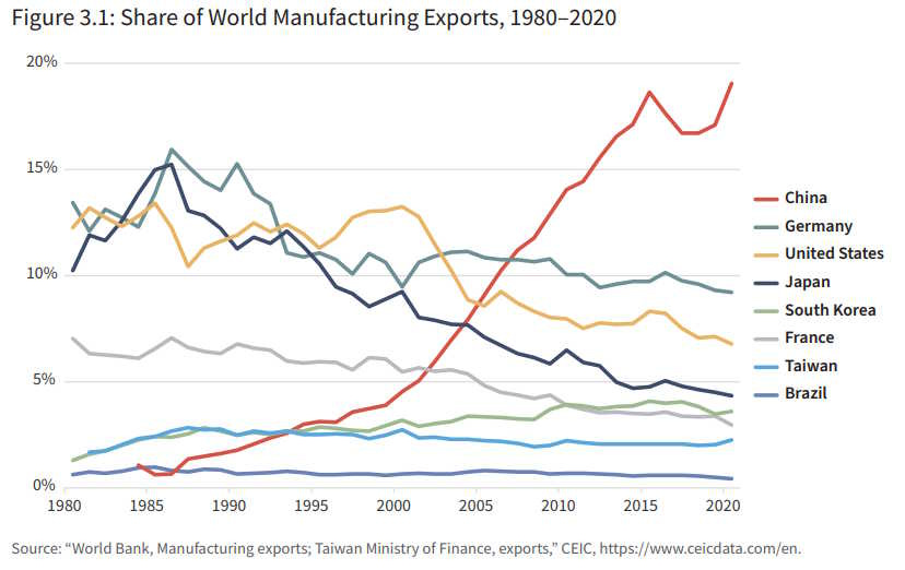 Along with this industrial policy, you saw a massive surge of Chinese manufactured exports flowing out to the rest of the world. The most recent export surge has been labeled the “Second China Shock”, but in fact the trend was already headed in that direction well before the pandemic: