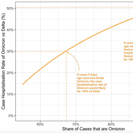 Now, that’s in a population with a significant amount of acquired immunity from pre-existing infection, so it’s possible that’s distorting the numbers here. But in New South Wales, an Australian state now suffering an Omicron outbreak, there was not much acquired immunity at all, and vaccination rates haven’t changed much between now and the Delta wave. And as Andrew Lilley notes in this excellent and careful thread, Omicron is also looking substantially less severe in NSW: