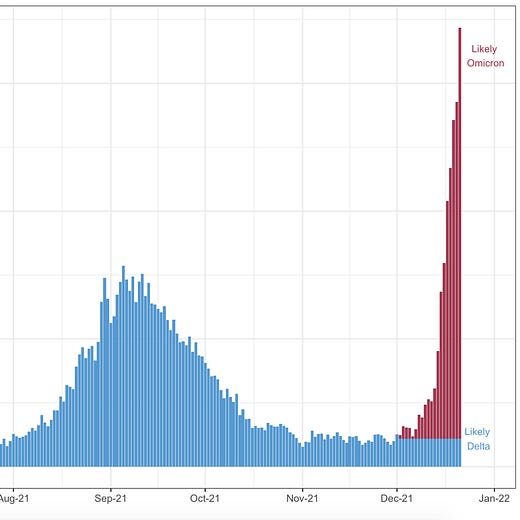 There are still a few small voices out there crying for harsh containment measures, and of course you should still wear a mask inside, but something tells me that this one isn’t going to be contained. Tom Frieden, former head of the CDC, says this is one for the history books — even with a fairly large percent of our populace either vaccinated or bearing immunity from a prior infection, Omicron is spreading “as fast as measles in a non-immune population”. And measles is the most contagious disease hitherto known. The question of whether we should “let ‘er rip” is a bit beside the point — by the time our authorities decide what to do, it will already have ripped.