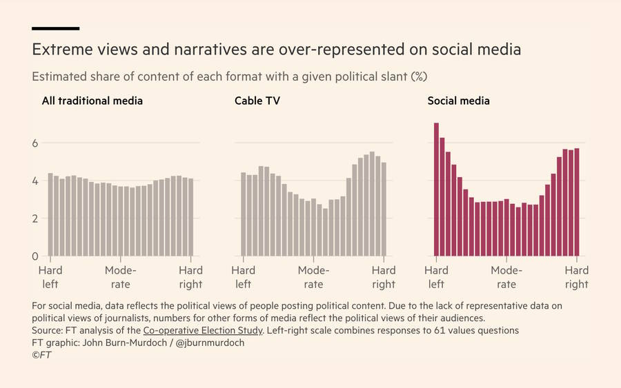 All of these effects — algorithmic elevation of divisive content, armies of bots and trolls, and intervention by foreigners — mean that social media is a uniquely polarizing force in our society. Nathan Witkin has a good post reviewing the evidence here, and rebutting those who have claimed that social media is politically benign: