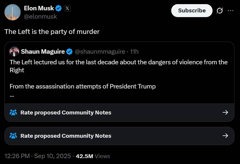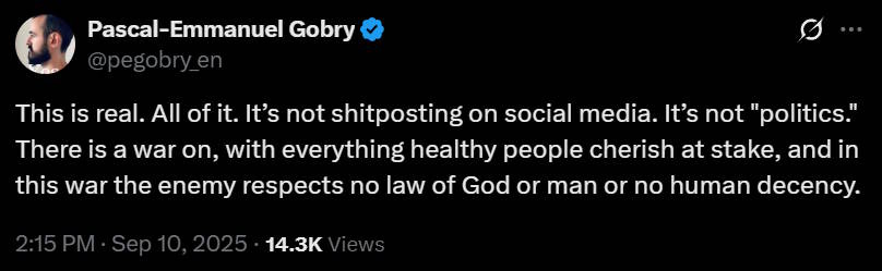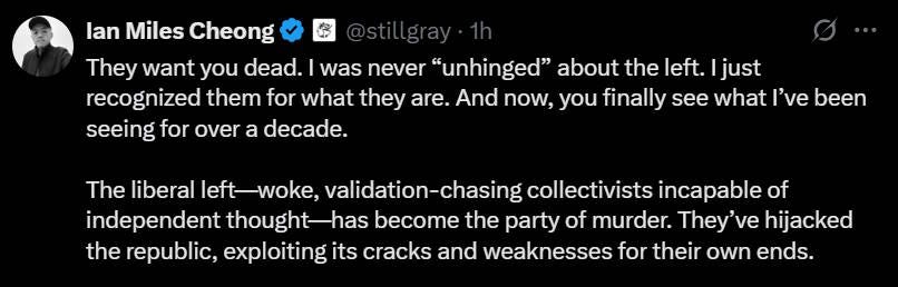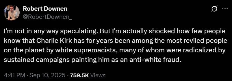 ::Deep breath:: Kirk’s assassination is a tragedy. He leaves behind two kids without a dad. It is awful. But can you please take a look at the rhetoric he was putting out? Lots of “great replacement” stuff.