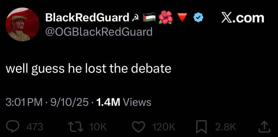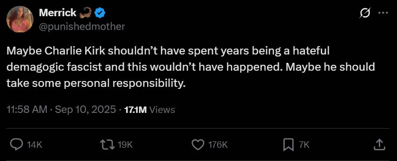 This is extremely frustrating, because away from the screeching online meme wars, elected politicians are generally very good about this stuff. Gavin Newsom, Barack Obama, Kamala Harris, Tim Walz, Nancy Pelosi, Zohran Mamdani, Joe Biden, and every other important Democratic politician rushed to condemn Kirk’s killing. Even some major leftist influencers like Hasan Piker condemned it.