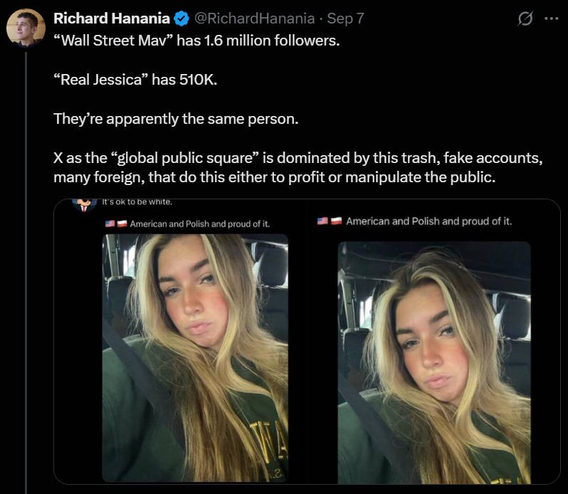 A lot of the people you read on social media are simply fake. For example, the popular right-wing account “Wall Street Silver” (now called “Wall Street Mav”) is probably not an elderly man in the finance industry; he turned out to be the same person who manages another account called “Real Jessica”: