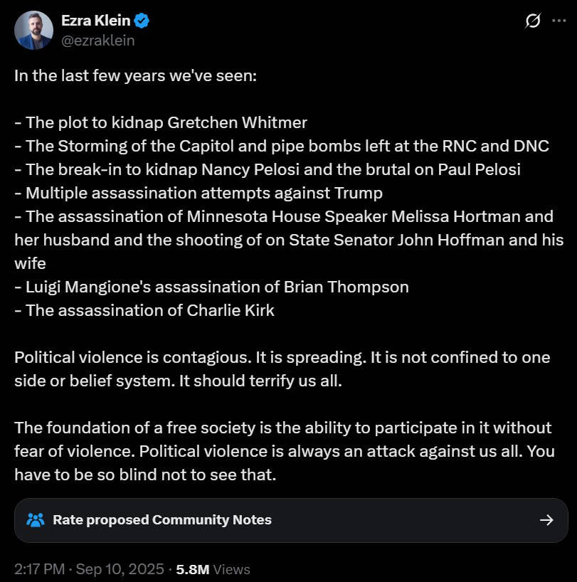 In fact, I still think that American society in general is calming down from the unrest of the 2010s. The number of people being radicalized by platforms like X and Bluesky is actually fairly small. But they’re the people who are the most engaged in politics, and so they have an outsized importance on the direction of the nation. Even as most Americans tune out politics, the people who are actually running the show remain glued to an X feed that shows them weapons-grade hatred all day long. And unfortunately, the crazies who buy guns and shoot at the politically influential class are also mainlining that same social media hate.
