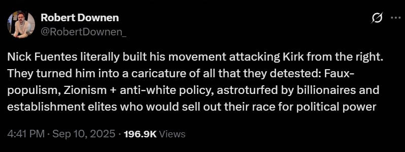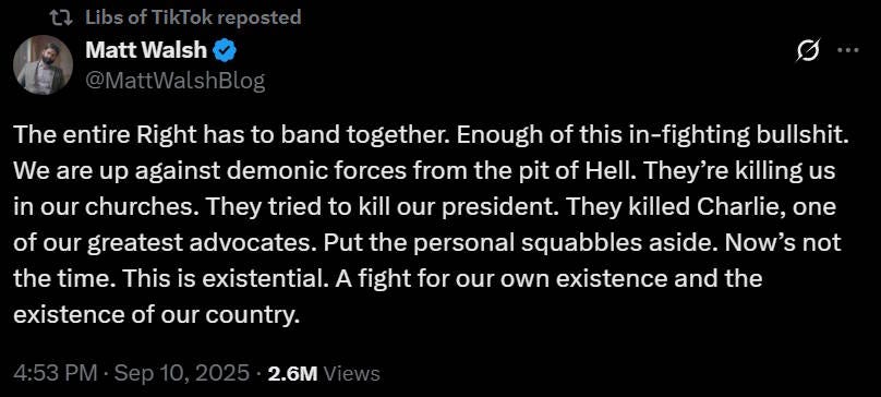 Because it’s not clear who shot Kirk, it’s not known what the motive was. It could be a confused, politically inscrutable lunatic, like the two assassins that took aim at Donald Trump last year. It could be someone on the political left, who hated Kirk’s conservative politics; there were certainly plenty of those. Or it could be someone on the political right, who thought Kirk wasn’t sufficiently rightist. For example, Kirk had received a lot of hate from the white supremacists known as “groypers”: