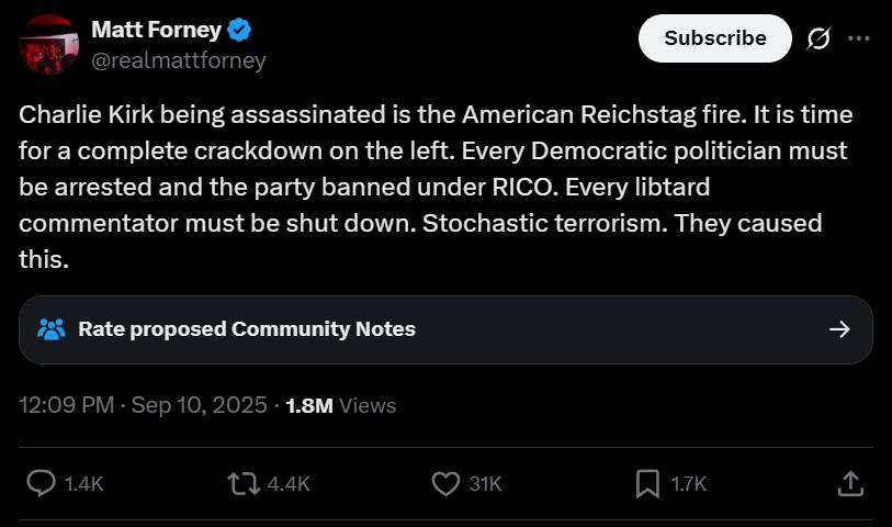 Even worse, some right-wing influencers are using Kirk’s assassination to call for the implementation of fascism and a violent purge of the Democratic Party: