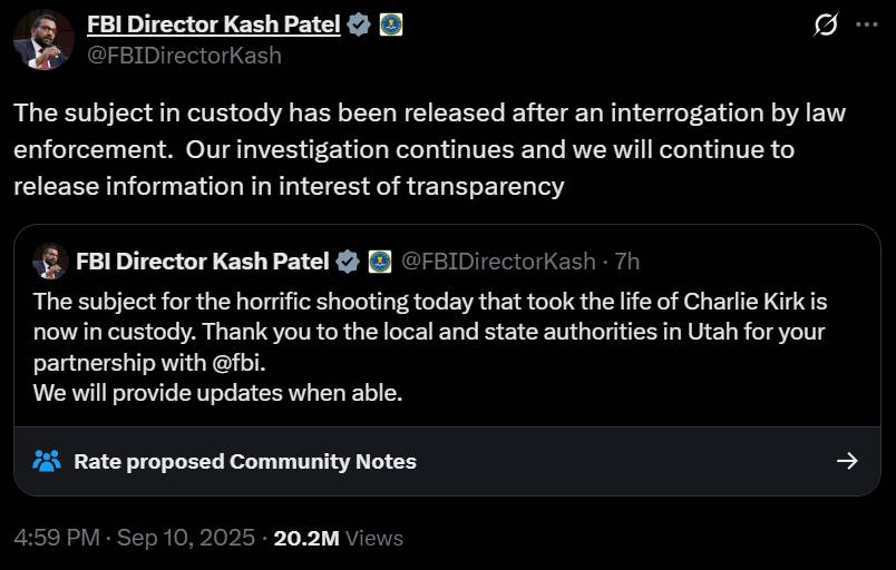 Charlie Kirk, a conservative commentator and founder of Turning Point USA, was brutally assassinated while participating in a live debate in Utah. As of this writing, the assassin has not been caught. FBI Director Kash Patel tweeted that the suspect had been apprehended, but a little while later tweeted that suspect had been released, and that the investigation was ongoing: