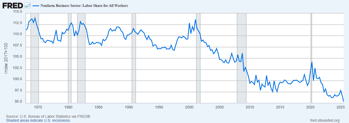 Worryingly, it took another sharp dive just in the third quarter of 2025. That probably isn’t AI — it’s too soon and too sudden — but a lot of people are going to be worried. And the longer trend is already disturbing.
