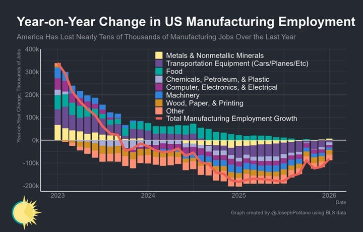 The manufacturing boom President Trump promised would usher in a golden age for America is going in reverse…Manufacturers shed workers in each of the eight months after Trump unveiled “Liberation Day” tariffs, according to federal figures…An index of factory activity tracked by the Institute for Supply Management shrunk in 26 straight months through December…[M]anufacturing construction spending, which surged with Biden-era funding for chips and renewable energy, fell in each of Trump’s first nine months in office.