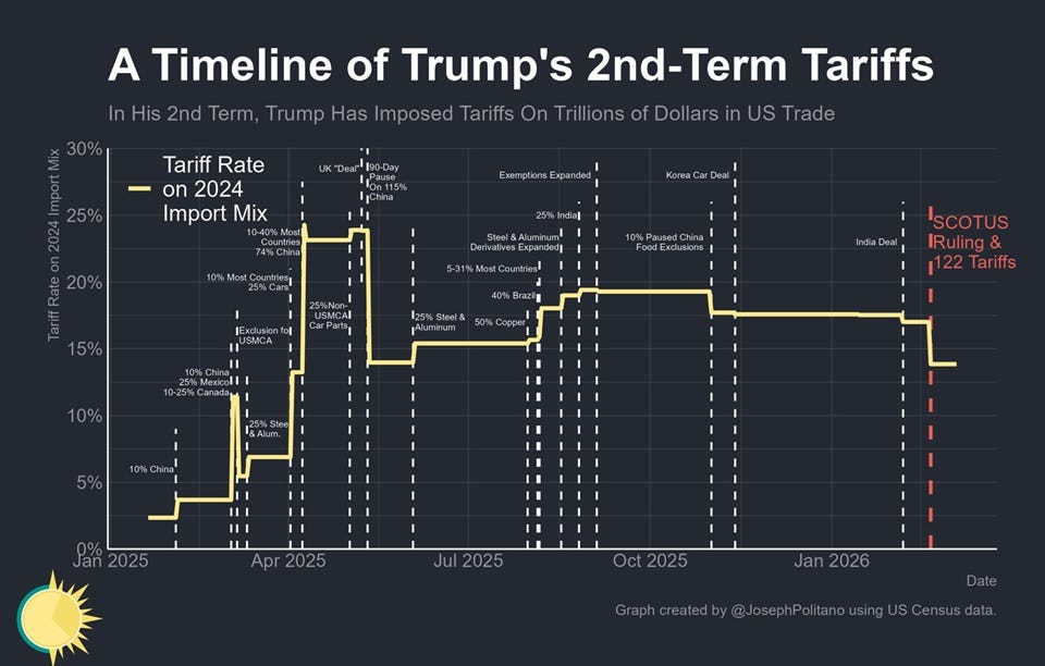 But tariffs are very complex, and there are a ton of exemptions. Because these tariffs are more blanket than the ones SCOTUS just struck down, and because they interact with other tariffs that are still on the books, the new regime could raise effective tariff rates to even higher levels than before the SCOTUS decision.