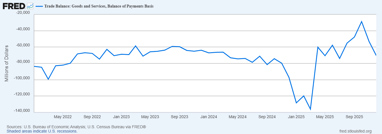 What was the point of these tariffs? It has never really been clear. Trump’s official justification was that they were about reducing America’s chronic trade deficit. In fact, the initial “Liberation Day” tariffs were set according to a formula based on America’s bilateral trade deficits with various countries.1 But trade deficits are not so easy to banish, and although America’s trade deficit bounced around a lot and shifted somewhat from China to other countries, it stayed more or less the same overall: