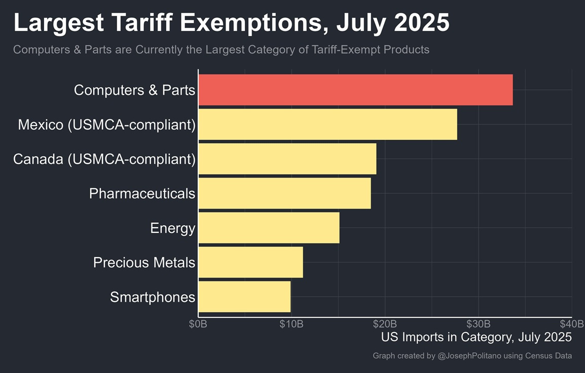 On some level, Trump — unlike pundits like Cass — seems to realize the basic economics of how tariffs hurt American industry. Recognizing the AI boom’s importance to the current economic expansion, he has granted huge exemptions for the computers that are being used to build AI data centers: