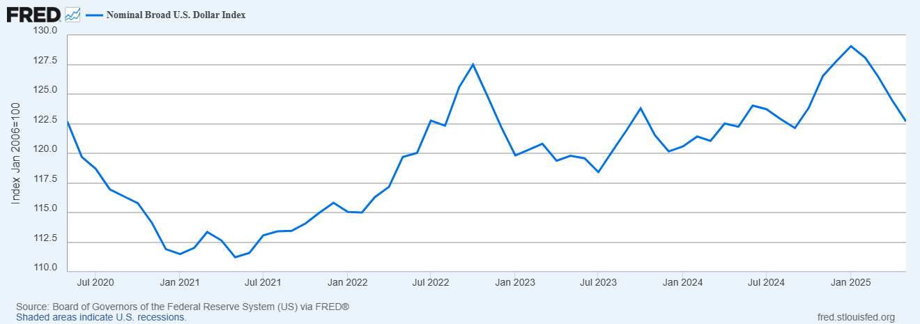 The dollar is a bit down from where it was before the tariffs, but overall it’s about where it was in previous years: