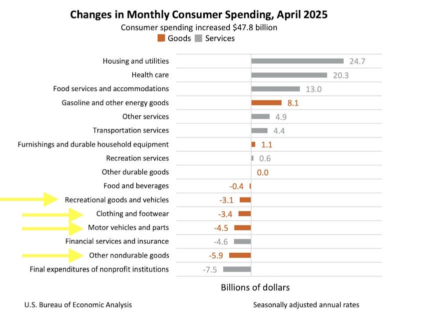 Meanwhile, real economic data is a bit weak, but doesn’t look too catastrophic yet. Americans are cutting back on consumption of the kinds of goods that got hit hardest by Trump’s tariffs: