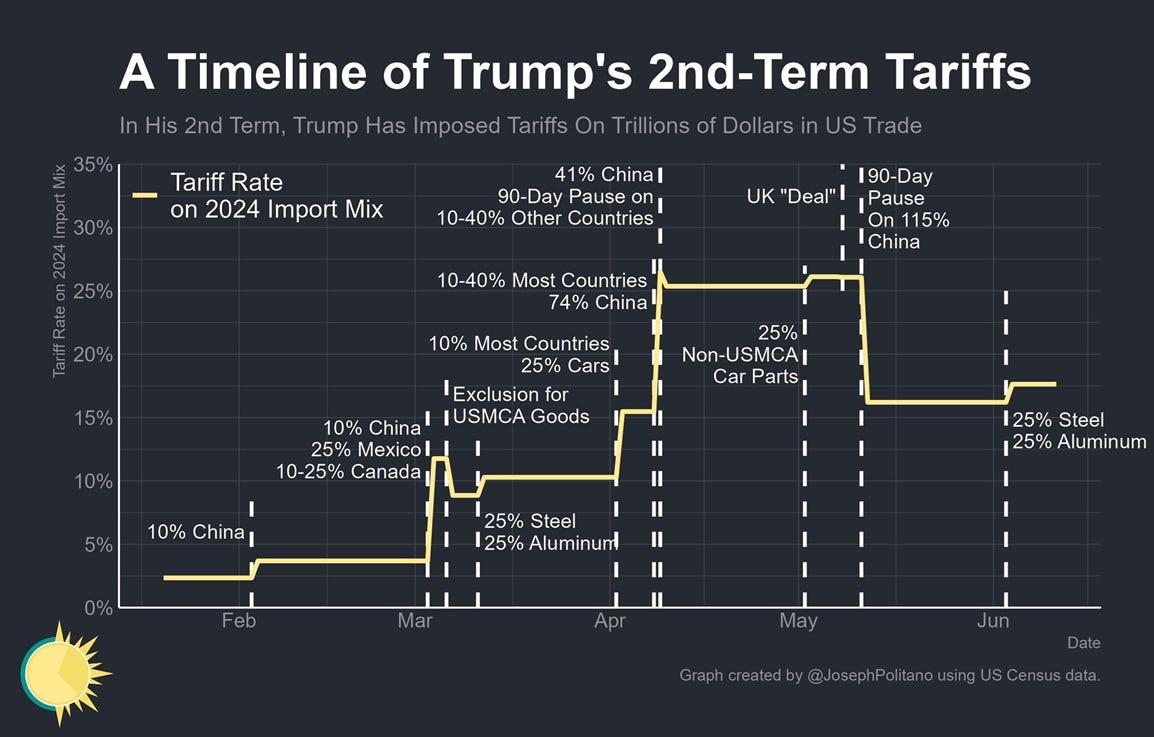 In any case, as a result of the blizzard of new tariff announcements and tariff pauses, the overall U.S. tariff rate keeps swinging wildly back and forth, but generally staying in the 10-20% range. Joey Politano has done a great job of tracking this: