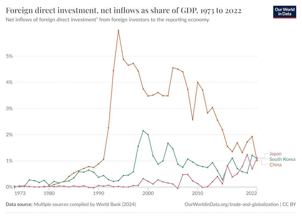 And amazingly, the plan seems to be working. In 2022, net FDI inflows to Japan were very slightly greater as a proportion of the economy than in either China or South Korea: