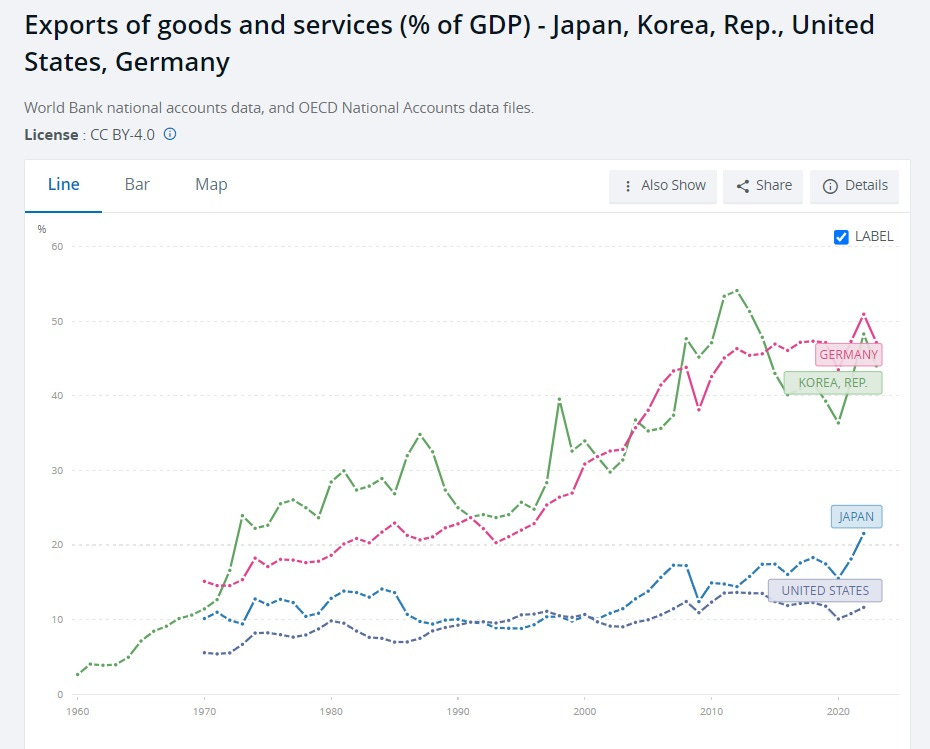 Americans often think of Japan as an export powerhouse, because of the international success of brands like Toyota, Honda, Sony, and Panasonic. And during the early days of the postwar miracle, Japan’s bureaucracy did strongly encourage exports, in order to earn precious foreign currency. But in fact, this lingering stereotype is badly mistaken — Japan has never really been an export-oriented economy like Germany or South Korea. It’s a domestically focused economy, more like the United States: