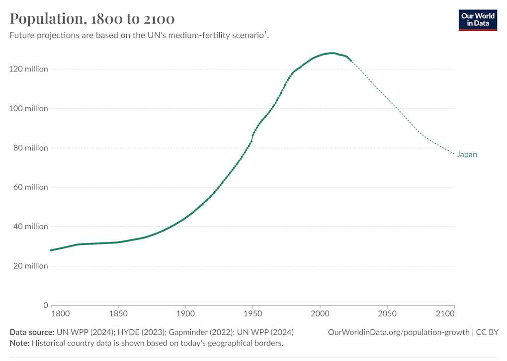 The second reason for Japan to focus on exports is that the domestic Japanese market is shrinking. Japan’s population is forecast to fall substantially over the remainder of this century: