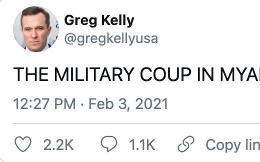There is substantial support for the coup attempt of 1/6 on the Right. Although a CBS News/YouGov poll the week after the Capitol attack found that most Republicans disapproved of the violence, it also found that fully half of Republicans said the insurrectionists were “defending freedom”, and almost half described it as an act of “patriotism”. Meanwhile, the online Right is so enamored of the idea of coups that they forced Newsmax’s Greg Kelly to reverse his condemnation of the recent coup in Myanmar: