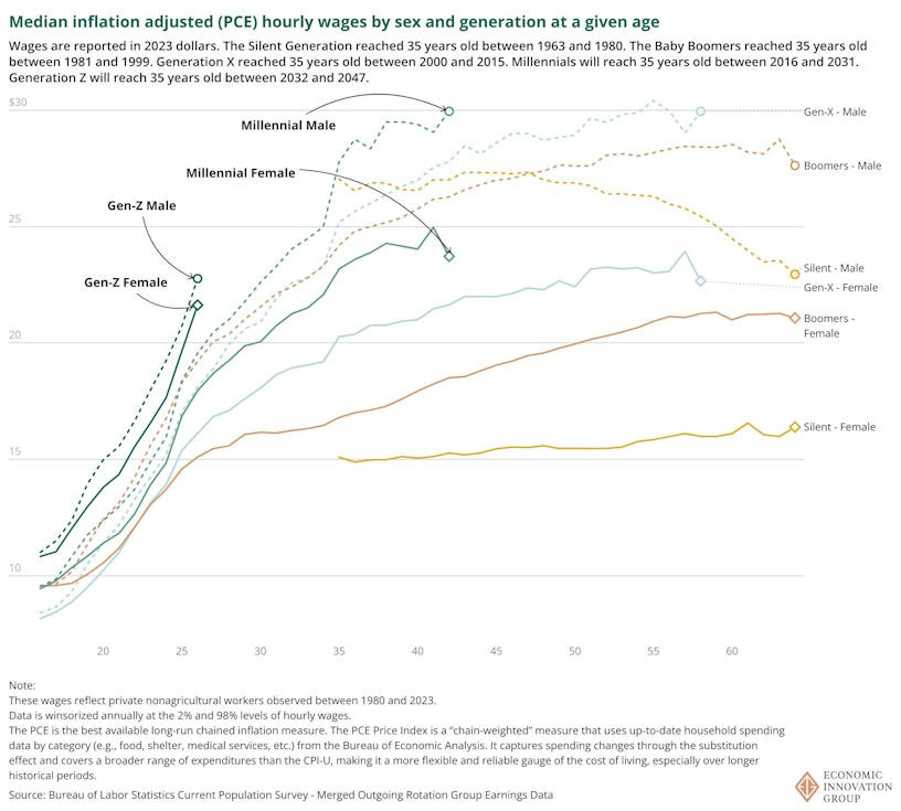 In many ways, the economy is working just fine for America’s young generations. For example, Zoomers and Millennial men have higher wages than previous generations did at similar ages, with Gen Z looking especially good: