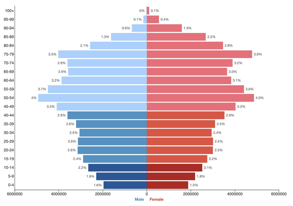 The country’s population pyramid shows this pretty clearly. The generation slightly older than me — now in their early and mid 50s — was actually the most populous, while the generation in their 20s right now is maybe only 60% as large:
