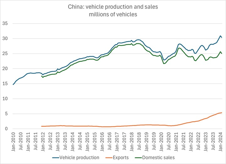 And even once China began paying its companies to export huge numbers of EVs, and became the world’s largest auto exporter in just a few years, most Chinese-made vehicles are sold in China: