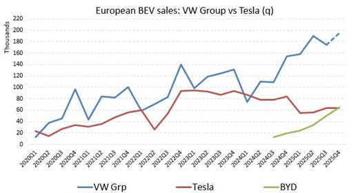 In fact, this might be what’s already happening in Europe. Europe put only modest tariffs on Chinese EVs, and at first their domestic car brands got clobbered. But recently, Volkswagen appears to have gotten its act together and started selling EVs in its home market: