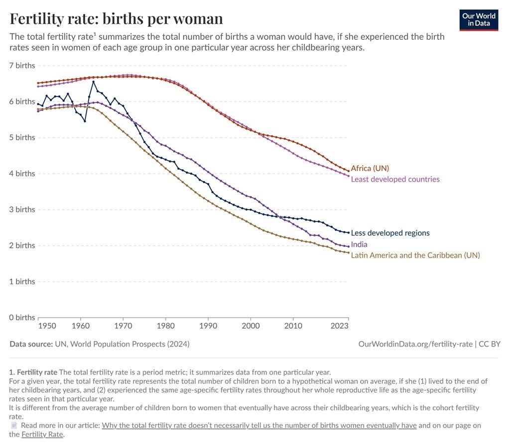 The first of these is just flat-out false. Asian fertility is lower than white fertility, for one thing. But fertility rates are also collapsing at an accelerating rate throughout the entire world, including Africa, Latin America, India, and poor countries in general: