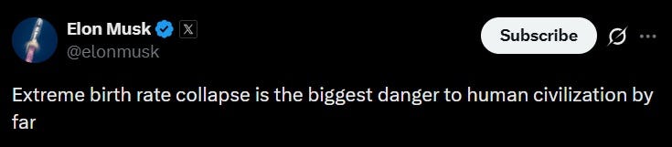 Take Elon Musk, for instance. The world’s richest man has clearly identified ultra-low birth rates as an existential threat: