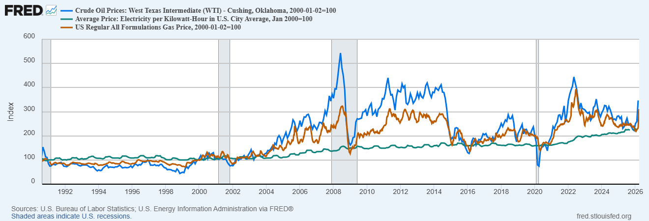 And it’s a headache that’s going to happen again, and again, and again. Here’s a comparison of oil and gasoline prices versus electricity prices in the U.S. since the turn of the century: