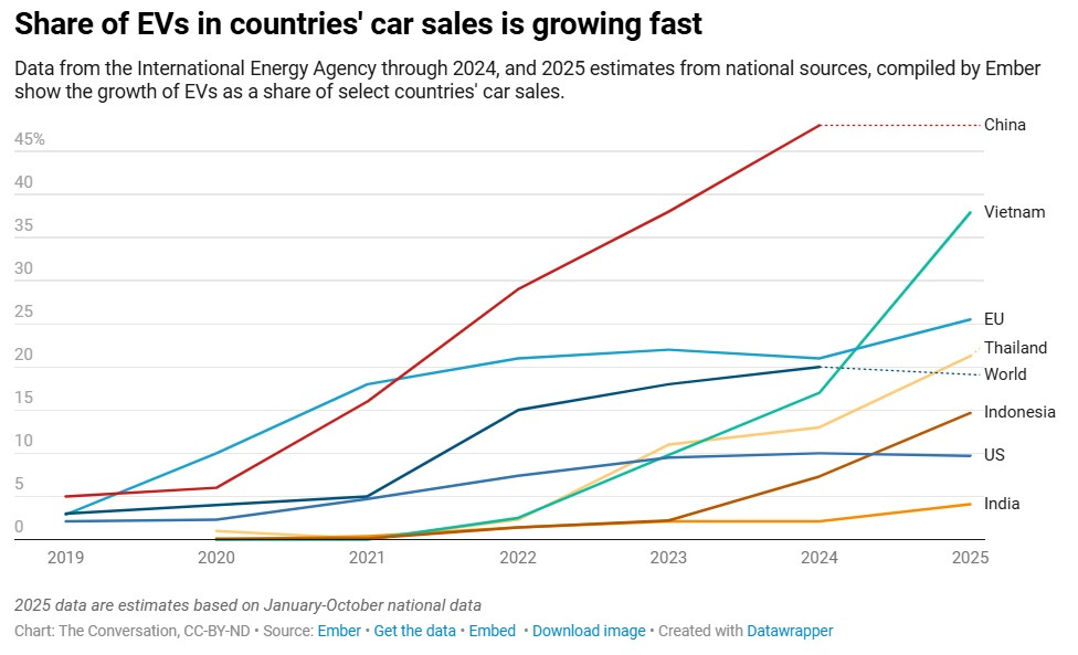 In China, Europe and a growing number of emerging markets, including Vietnam and Indonesia, electric vehicles now make up a higher share of new passenger vehicle sales than in the United States...That means the U.S. pullback on EV production is…an industrial competitiveness problem, with direct implications for the future of U.S. automakers, suppliers and autoworkers. Slower EV production and slower adoption in the U.S. can keep prices higher, delay improvements in batteries and software, and increase the risk that the next generation of automotive value creation will happen elsewhere.