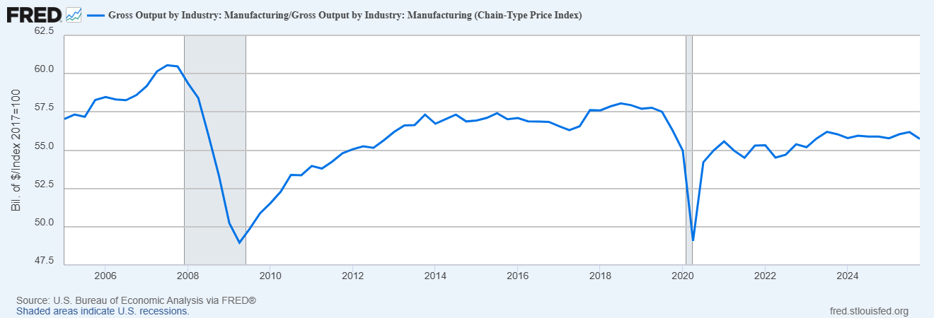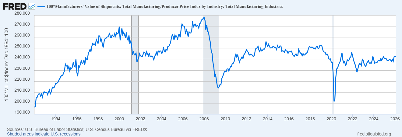 I guess if you squint very hard, you can see a slight rise since the end of 2024. But really this is just the same story as before: American manufacturing has been stagnating since 2008.