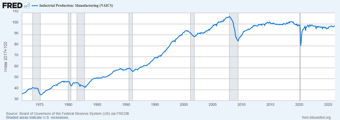 Do you see a “stealth manufacturing boom” since January 2025? I sure don’t. What I do see is the continuation of a decades-long stagnation in American manufacturing.