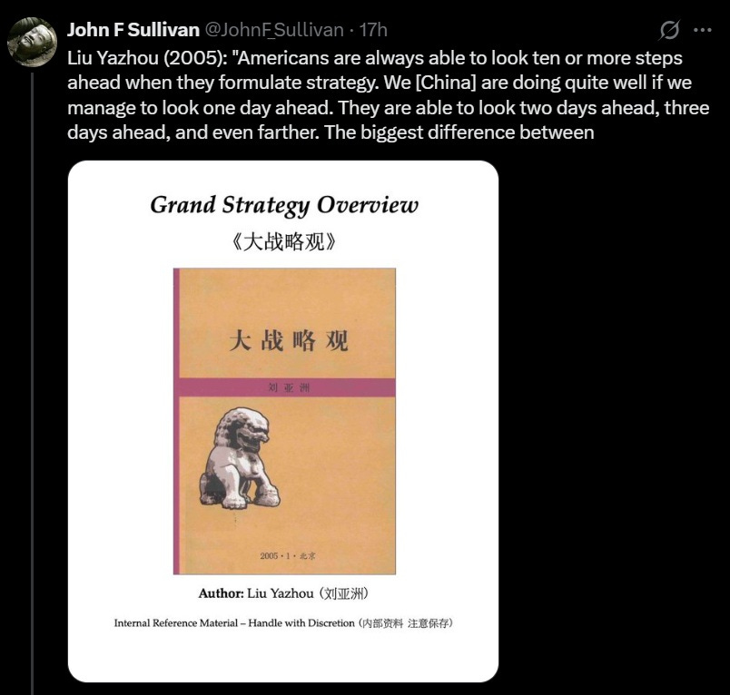 Anyway, of all of these cliches that books like Allison’s Destined for War rely on, the one that people seem to come back to the most — and the one that most annoys me — is the idea that Chinese leaders are more careful planners and long-term thinkers than American leaders.