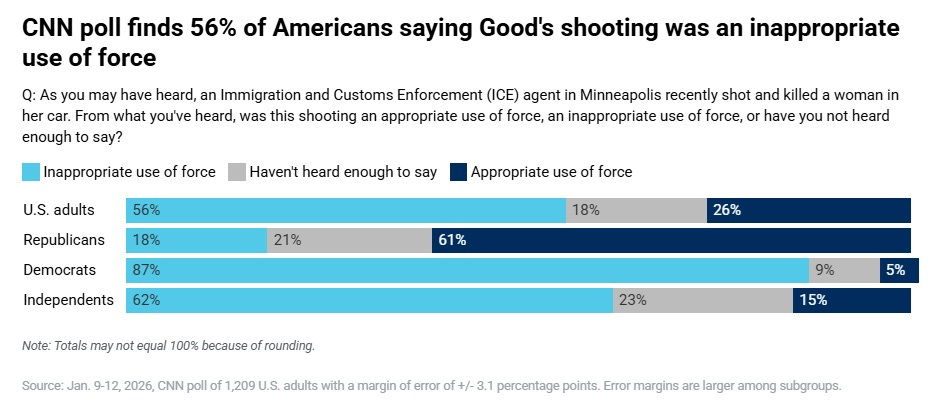 But there are fewer of these than before. The furor over the killing of Renee Good and the ICE raids in Minnesota and elsewhere has not died down and vanished into the bottomless pit of the news cycle like almost every other outrage during the long Trump Era A recent poll found that 82% of Americans have seen the video of Good’s killing, and by and large they agree with the obvious interpretation that the killing doesn’t look like self-defense. Many more Americans say the shooting was unjustified than say it was justified: