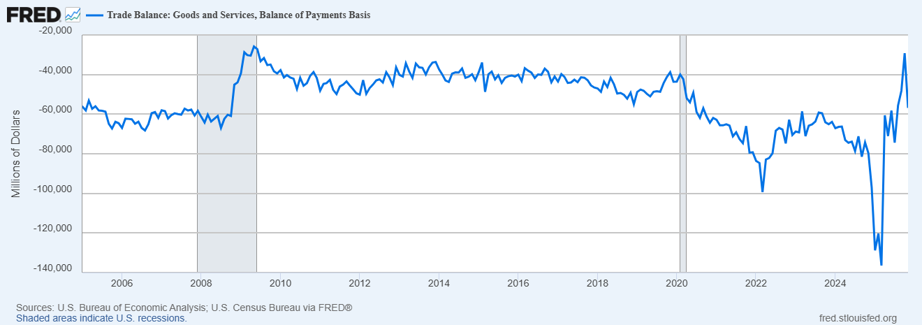Tariffs aren’t creating a wave of manufacturing jobs for Americans; in fact, manufacturing jobs are decreasing. But it’s also worth asking whether tariffs are even having an effect on America’s overall trade deficit. Recall that Trump thinks trade deficits are bad in and of themselves — a sign of American “defeat” in a global competition, and a way in which America is dependent on foreigners.